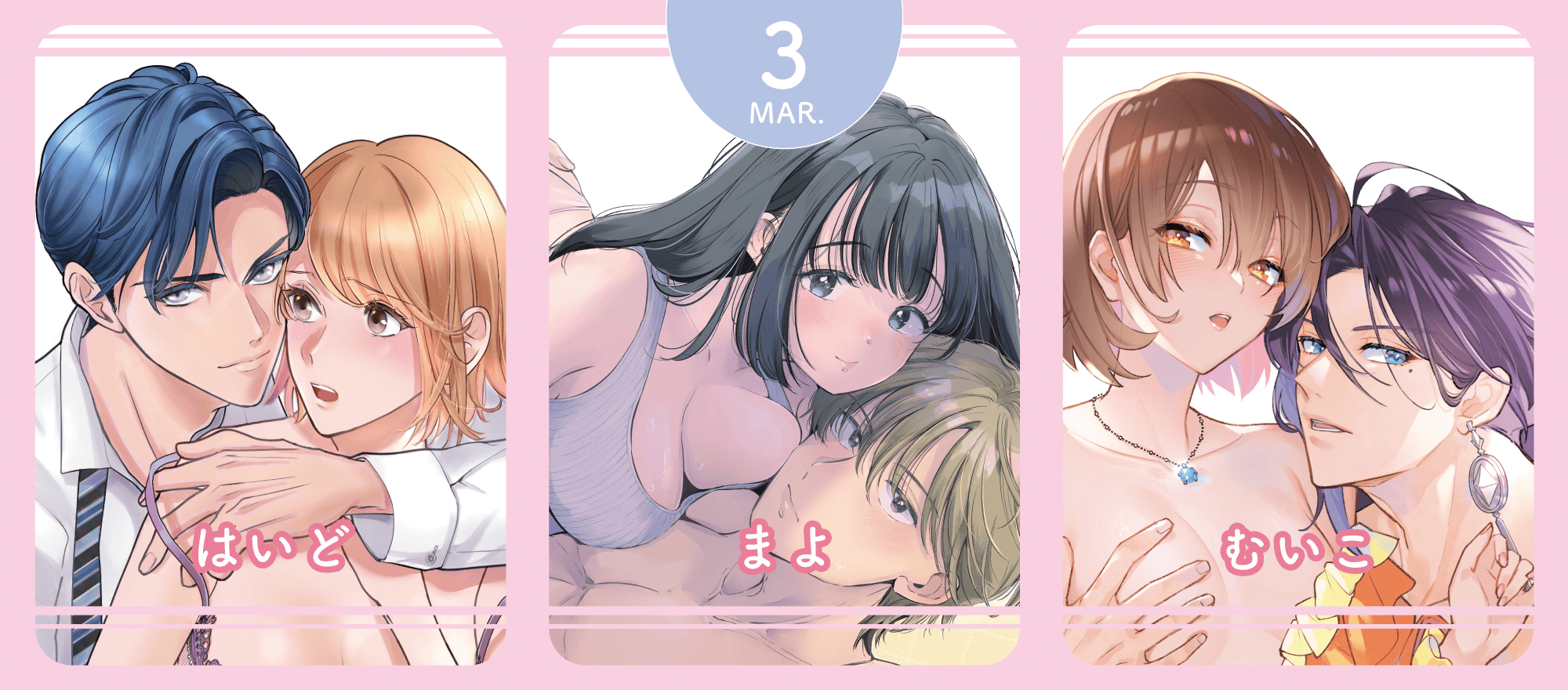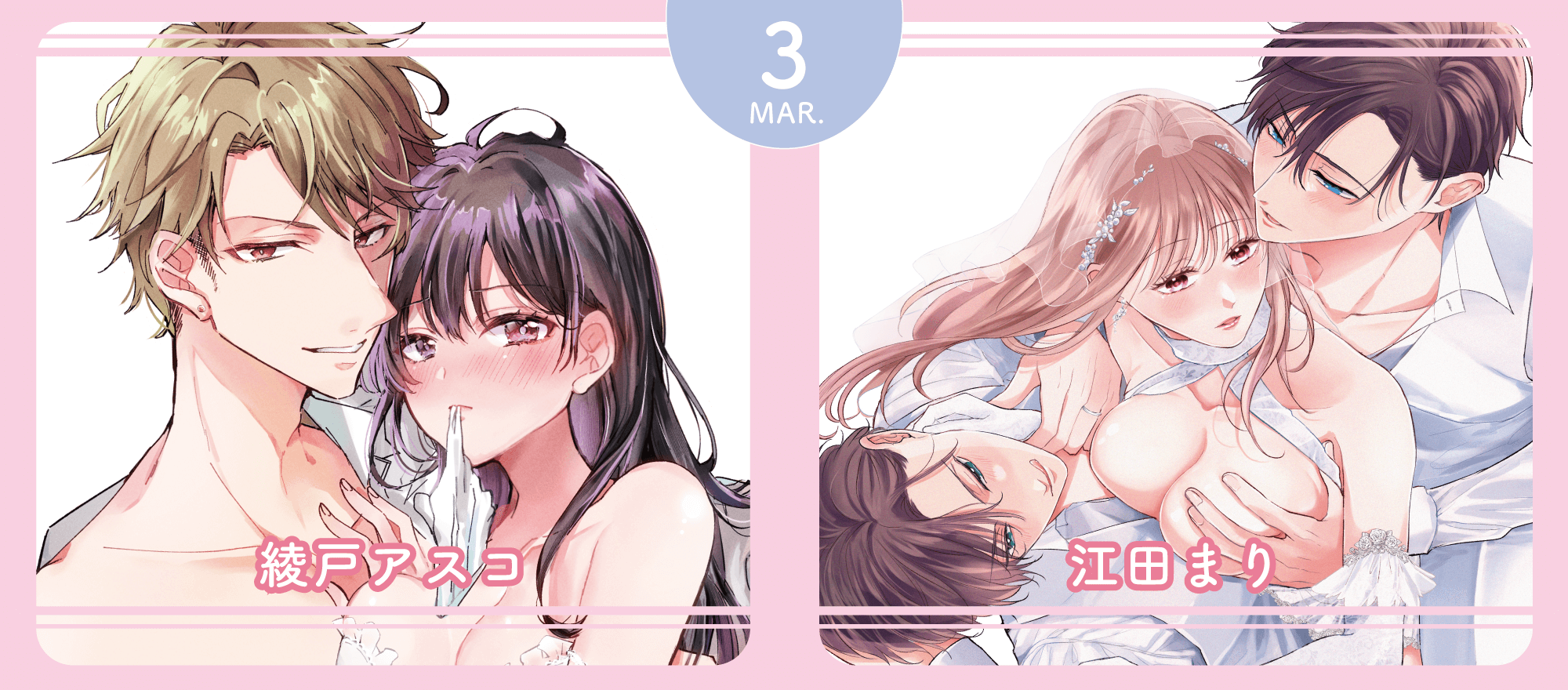 2026年3月配信のお知らせ2026年2月27日2月19日配信♡岡野さや先生『盲愛軍師は専属メイドを花嫁に希う 重たい愛で、奥まで貫く一途な秘め事』特典情報2026年2月3日2026年2月配信のお知らせ2026年1月30日執着ドクターは初恋彼女を離してあげない ~雨宮兄弟の歪んだ溺愛~ ♡R18版配信2026年1月23日試し読み盲愛軍師は専属メイドを花嫁に希う 重たい愛で、奥まで貫く一途な秘め事岡野さや2026年2月19日発売試し読み試し読み絶対抗えない甘い命令【Dom/Subユニバース】上漫画:poco. 原作:兎山もなか 2026年1月22日発売試し読み試し読み絶対抗えない甘い命令【Dom/Subユニバース】下漫画:poco. 原作:兎山もなか 2026年1月22日発売試し読み試し読みシたいこと全部叶えてやるよ。 ガテン系男子に獣SEX仕込まれてます漫画:辰日ろし 原作:森野じゃむ2025年12月25日発売試し読み3月6日配信開始試し読み転生先はR18乙女ゲームですが、初夜の相手が推しじゃないなんて聞いてません! −悪役軍師と愛欲夫婦(仮)生活−むいこリーゼ嬢主催のお茶会で、ゲームで見たそのままの光景に思わず釘付けになる友里子。すると、レオンハルトが急に後ろからーー試し読み3月6日配信開始試し読み夫婦未満、レンアイ以上。 天然床上手な新妻はハイスペ(+微ヘタレ)夫を翻弄しますまよ「好きって伝えると涙が出るんですね」初めて繋がった2人の気持ちと夫婦のカタチ。ベランダで、ベッドで…愛を確かめ合う最終回試し読み3月6日配信開始試し読みハイスペ幼馴染の溺愛策略 〜ハジメテの快感は全部、彼に教えられました〜はいど会社で潤が病欠と聞いた唯月は、退勤後に彼の自宅へ向かうことに。一方の潤は、中学時代のとある出来事を夢で見ていて…試し読み3月6日配信開始試し読み今夜はどっちの“オレ”に抱かれたい? 上司がWでエロ全開に迫ってきます!!江田まり二哉とデートを楽しみつつも、彼の様子に違和感を覚える志保。そんな中、二哉は夢の中で志保と初めて会った日のことを話し始め…試し読み3月6日配信開始試し読み(元)俺様王子の執愛からは逃れられない ~元執事の私、今世ではカラダごと愛される運命です~綾戸アスコ今度は俺があいつの未来を邪魔しちゃいけないーーそんな若俊の想いを偶然聞いてしまったこころは?前世からの想いが繋がる最終回試し読み2月6日配信開始試し読みいじわる上司の環さん 憧れ上司のウラの顔は、私泣かせの飢えた暴君才師楚海久しぶりの再会に燃え上がる二人。「気持ちいとこ、シて…」積極的な冬香に興奮がやまない環は甘く激しい前戯で何度も責め立て…試し読み2月6日配信開始試し読みヤバ愛(あい)淫ストラクターアルジェントついに、瀬名とゴムなしでエッチをしてしまった凪。これからもずっと一緒にいるために、二人が選んだ未来とは――?えろキュンMAX最終回!試し読み1月6日配信開始試し読み孕婚契約。〜今日から1年、寡黙な許婚様に毎晩奥まで注がれます〜黒宮ゆねこ一紗の旧友・麻紀が使用人として九条家で世話になることに!賑やかな日常を送る遥だったが、夜は一紗からの甘い愛撫で蕩かされ…試し読み12月6日配信開始試し読み初恋焦がして。 こじらせ幼なじみに好きってイッてほしい甘露かんろ「また勘違いされちゃう」「好きでもなんでもない」 長いすれ違いがついにーー!? 好きって言いたい、言われたい、濃密エッチな最終回。試し読み12月6日配信開始試し読み攻略対象は性悪エッチな妖怪様 〜惚れさせるはずが、イジワルに抱かれて濡らされて〜三波あけ生徒が受けた呪いの調査の為、カガリと街に下りることになった霖。すると、そこではちょうどお祭りが開かれていてーー試し読み12月6日配信開始試し読み求愛婚 〜18年振りに再会した御曹司に毎晩イキすぎる程愛されています〜和 杏樹突然現れた真仲と蓮が一触即発になりかけている中、そこにやって来たのはーー18年分の愛を感じる、幸せ溢れる最終回!試し読み11月6日配信開始試し読み盲愛軍師は専属メイドを花嫁に希う 重たい愛で、奥まで貫く一途な秘め事岡野さや連れ去られたエルシャを追い、馬車をとらえるハインツ。無事に助け出せるのか!? 軍師とメイド、身分違いの恋の行方はーー試し読み11月6日配信開始試し読み君のカラダで教えて欲しい –アブノーマルすぎる作家と疑似恋愛始めました–草野福総一郎の新たな一面を知り、少しずつ惹かれ始めていることを自覚する伊織。そんな中、総一郎から突然呼び出されてーー?試し読み10月6日配信開始試し読み呪われてもキミを愛す。~発情兎は四六時中SEXがシたい~漫画:堂夏ちくわ 原作:森野じゃむ呪いを解くためのもう一つの方法を聞かされた小春。どうしても汐音を助けたい彼女がとった行動とは…。想いあふれる最終回!試し読み9月6日配信開始試し読み花に愛咬 最強従者とイく旅路青日晴過去を知り、お互いの望みを伝え合い、さらに深まったふたりの関係。ハラハラどきどき主従旅、幸せいっぱいの最終話♪試し読み9月6日配信開始試し読みワケあり紳士は激辛好きOLを××